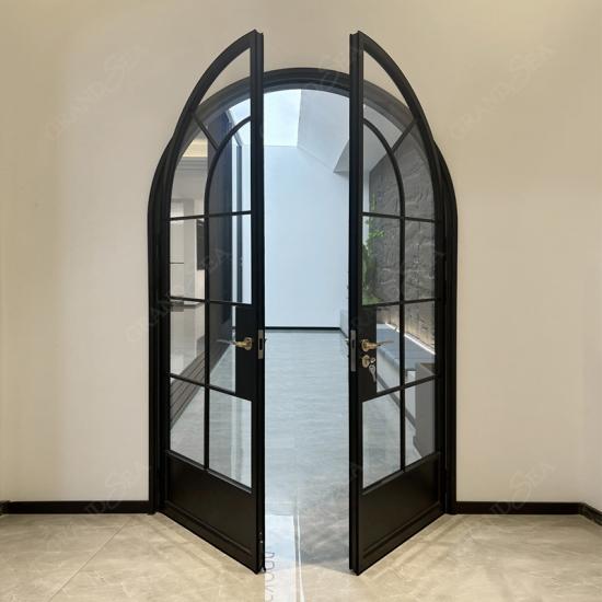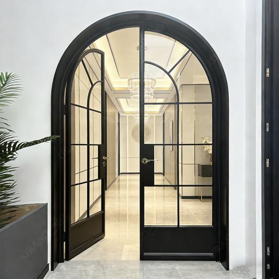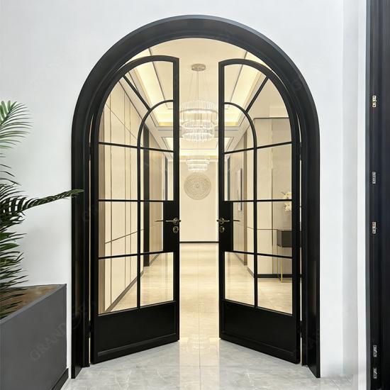 Este produto de alta qualidade porta dupla francesa em arco A porta apresenta uma estrutura em liga de alumínio preto e design com grade de vidro. Além disso, está equipada com um sistema de travamento de alta segurança, garantindo proteção antirroubo e excelente isolamento térmico. O corpo da porta é fabricado em alumínio extrudado 6063-T5 com acabamento em pintura eletrostática a pó de alta resistência às intempéries; além de ser excepcionalmente durável, é ideal para uso em casas, residências e espaços internos.
